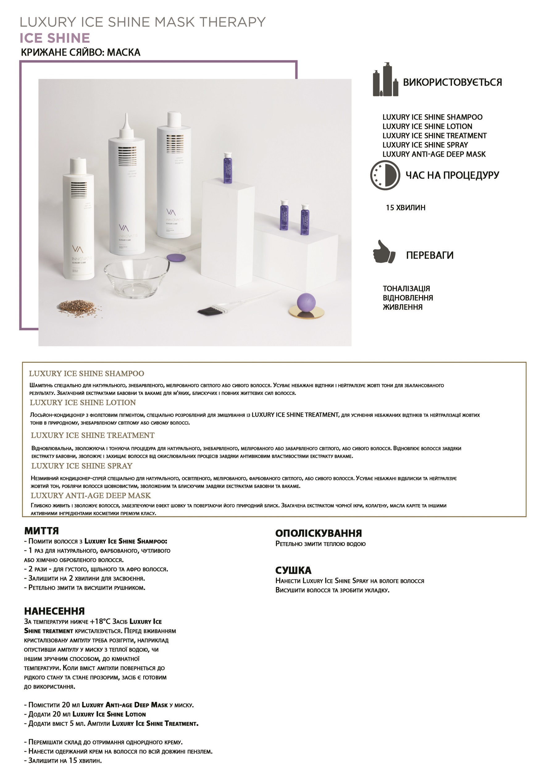 За температури нижче +18℃ засіб LUXURY ICE SHINE TREATMENT кристалізується. Перед вживанням кристалізовану ампулу треба розігріти, наприклад опустивши ампулу у миску з теплою водою, чи іншим зручним способом, до кімнатної температури. Коли вміст ампули повернеться до рідкого стану та стане прозорим, засіб є готовим до використання● Помістити 5 мл LUXURY ICE SHINE DEEP MASK у миску● Додати 20 мл LUXURY ICE SHINE LOTION● Додати вміст 5 мл ампули LUXURY ICE SHINE TREATMENT● Перемішати склад до отримання однорідного крему● Нанести одержаний крем на волосся по всій довжині пензлем● Залишити на 15 хвилин