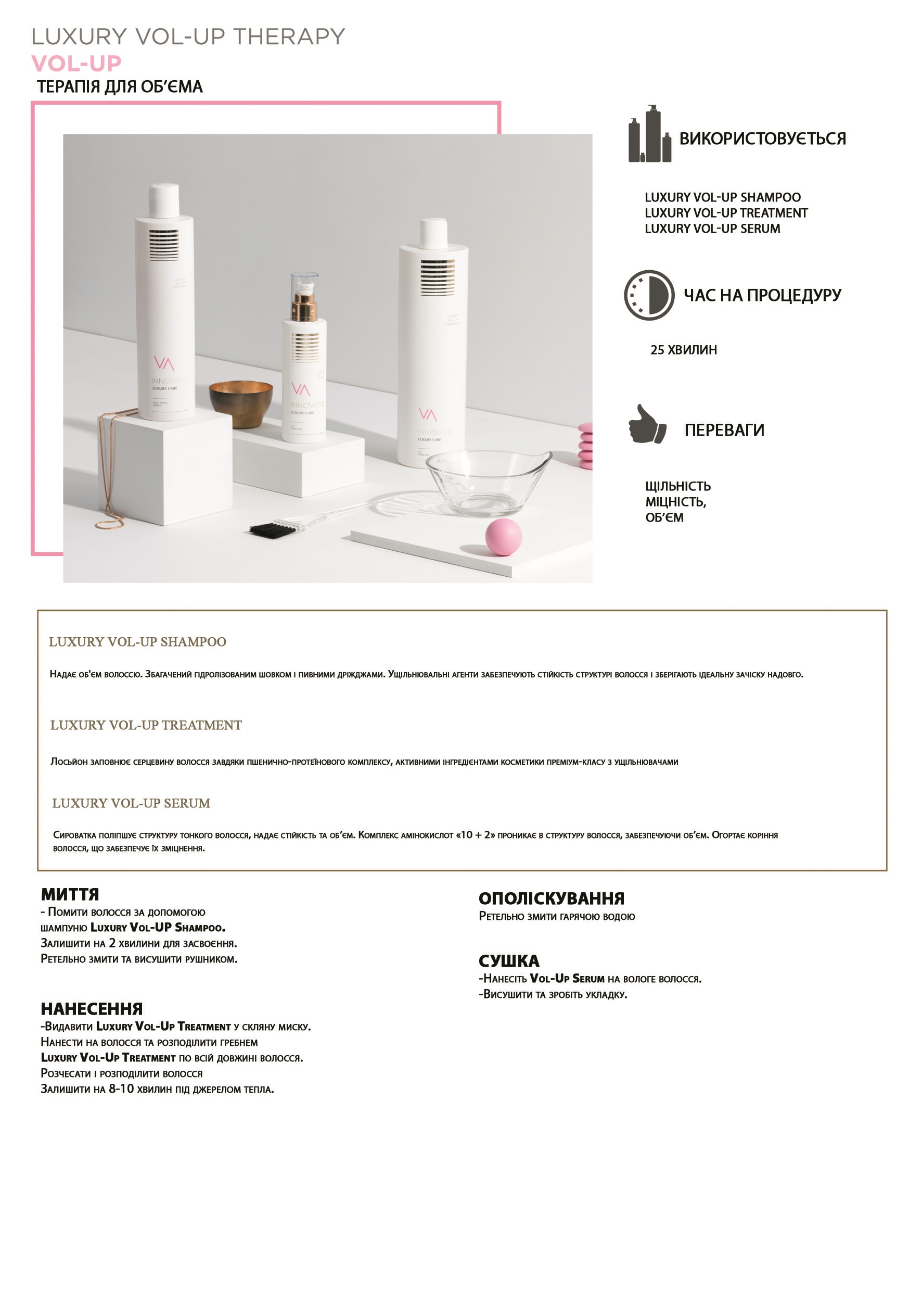 ● Видавити LUXURY VOL-UP TREATMENT у скляну миску. ● Нанести на волосся та розподілити гребнем по всій довжині волосся● Залишити на 8-10 хвилин під джерелом тепла